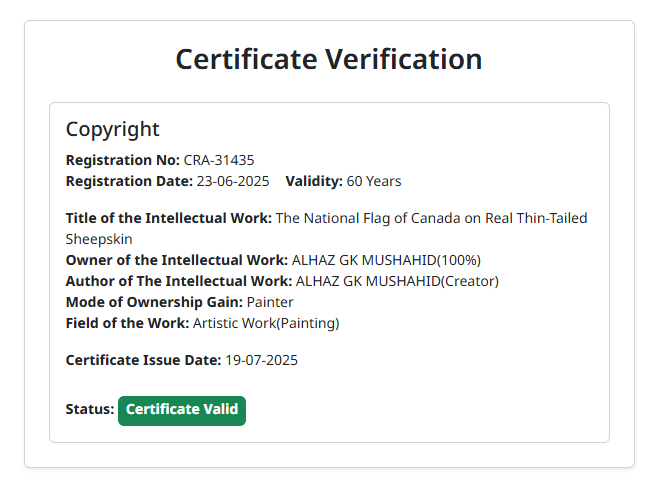 This exquisite artwork, The National Flag of Canada on Real Thin-Tailed Sheepskin, beautifully captures the iconic red and white flag with its stylized 11-pointed maple leaf. Created by the celebrated artist Alhaz GK Mushahid after 5 years of dedicated research and he discovered the innovative technique of hand-painting on sheepskin for the first time in the world of art. This masterpiece reflects Canada’s rich heritage.